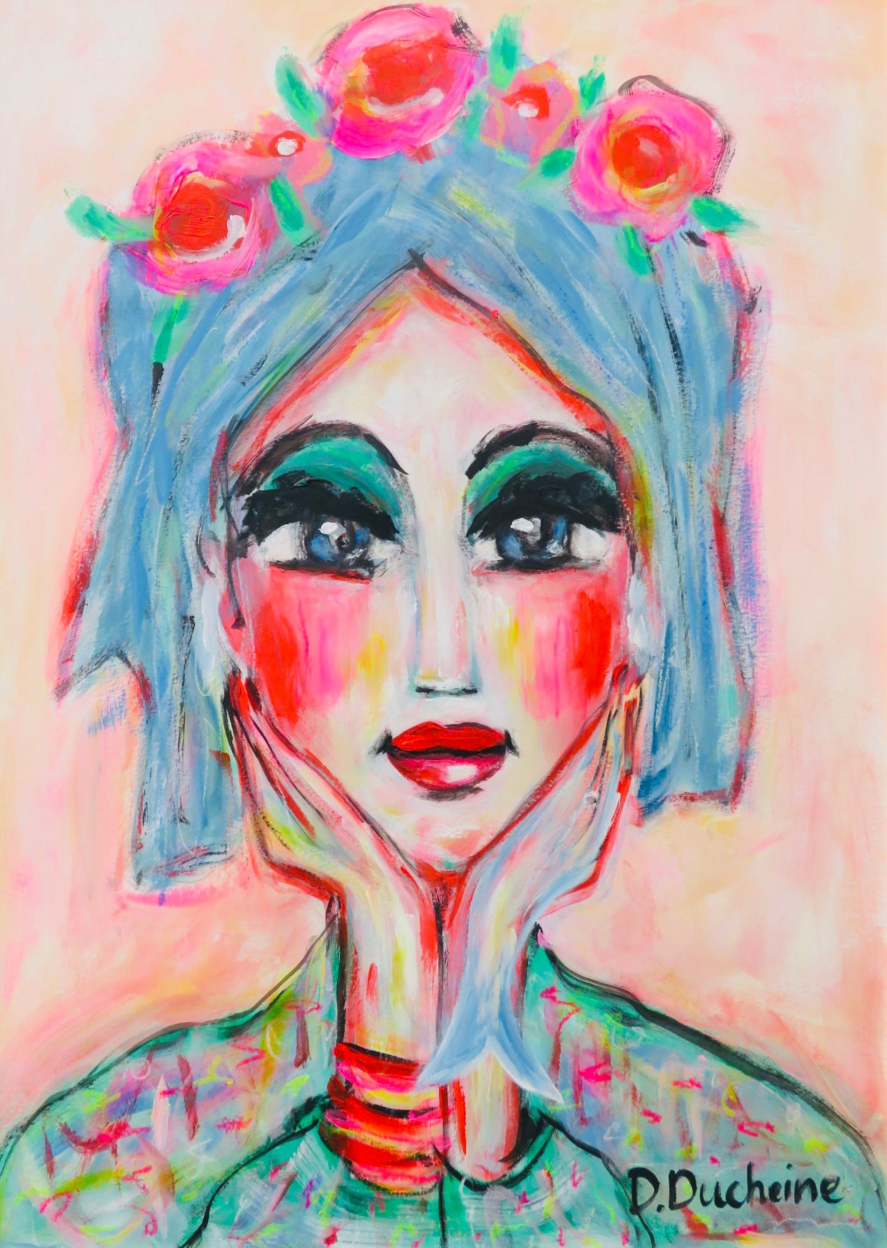 Haar handen rusten zacht langs haar gezicht en daar, subtiel en magisch, verschijnt een pastelkleurige vis. Een herinnering aan het duiken in Egypte waar een pastelkleurige vis mij steeds volgde op zoek naar koraal en vrijheid.