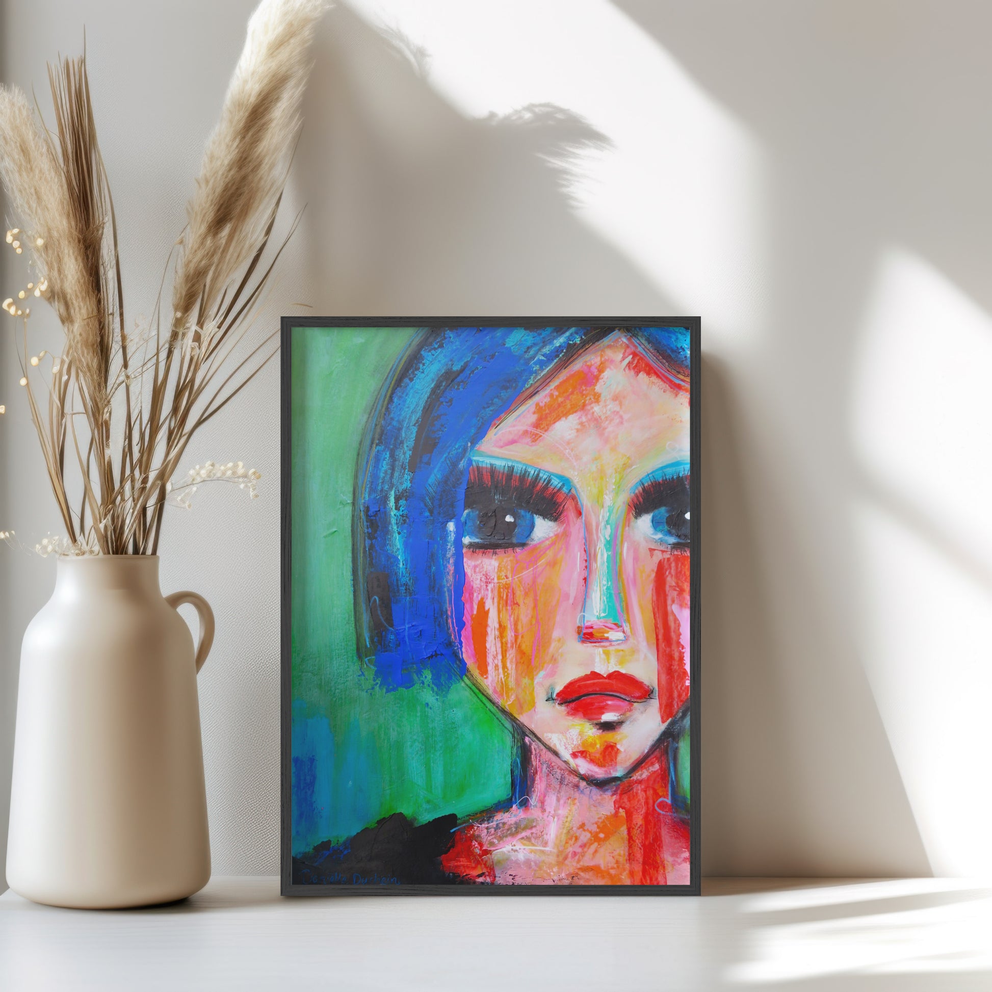 Met acrylverf, acrylstiften en een wild paletmes bouwde ik laag op laag aan haar energie. Spelend contrast tussen sereen groen en knallend blauw.