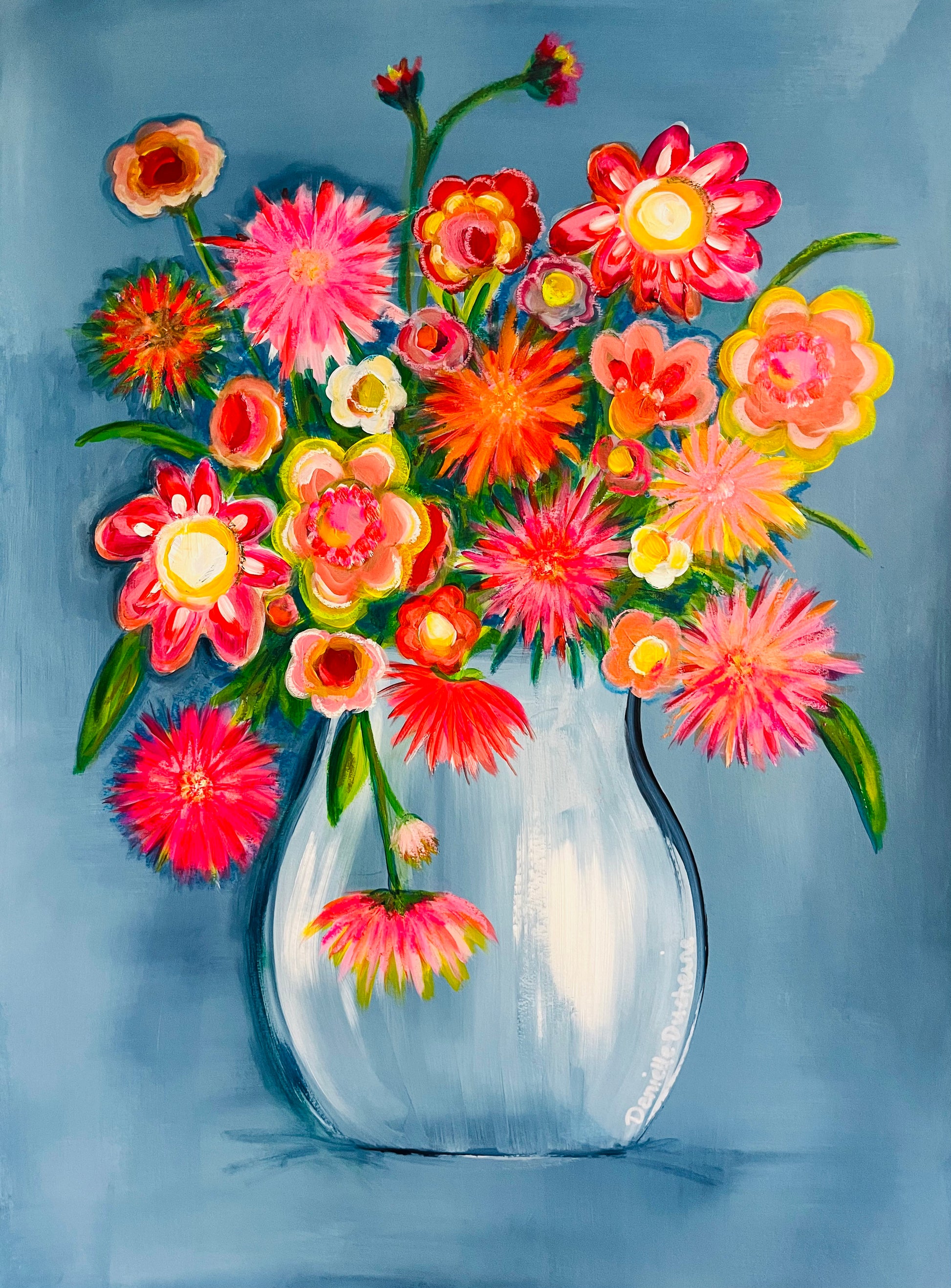 Tijdens het schilderen liet ik elke bloem haar eigen karakter krijgen.