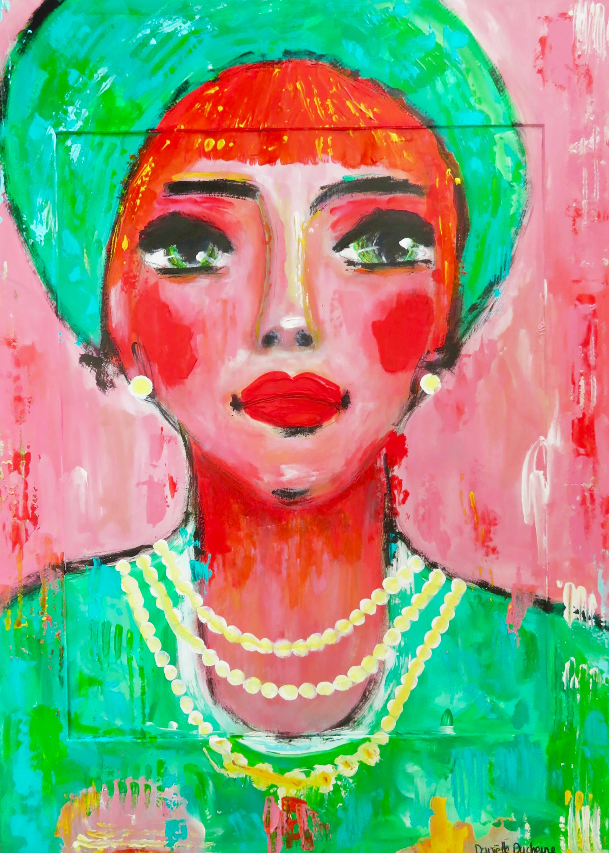 De mee geschilderde omlijsting duwt haar bijna het doek uit.