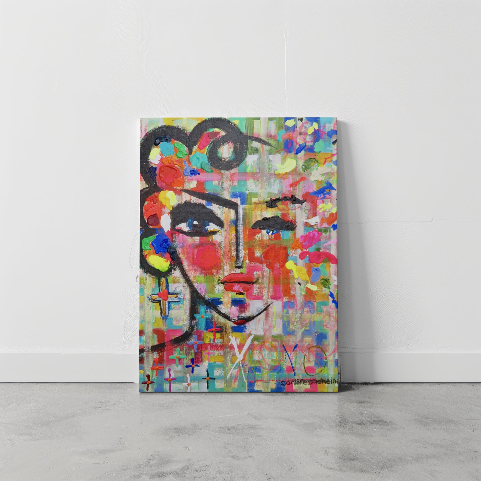 Het werk ademt levenslust en beweging. De kruizen en woorden vloeien samen tot een ritmisch patroon vol betekenis, terwijl het gezicht midden in de chaos rust uitstraalt.