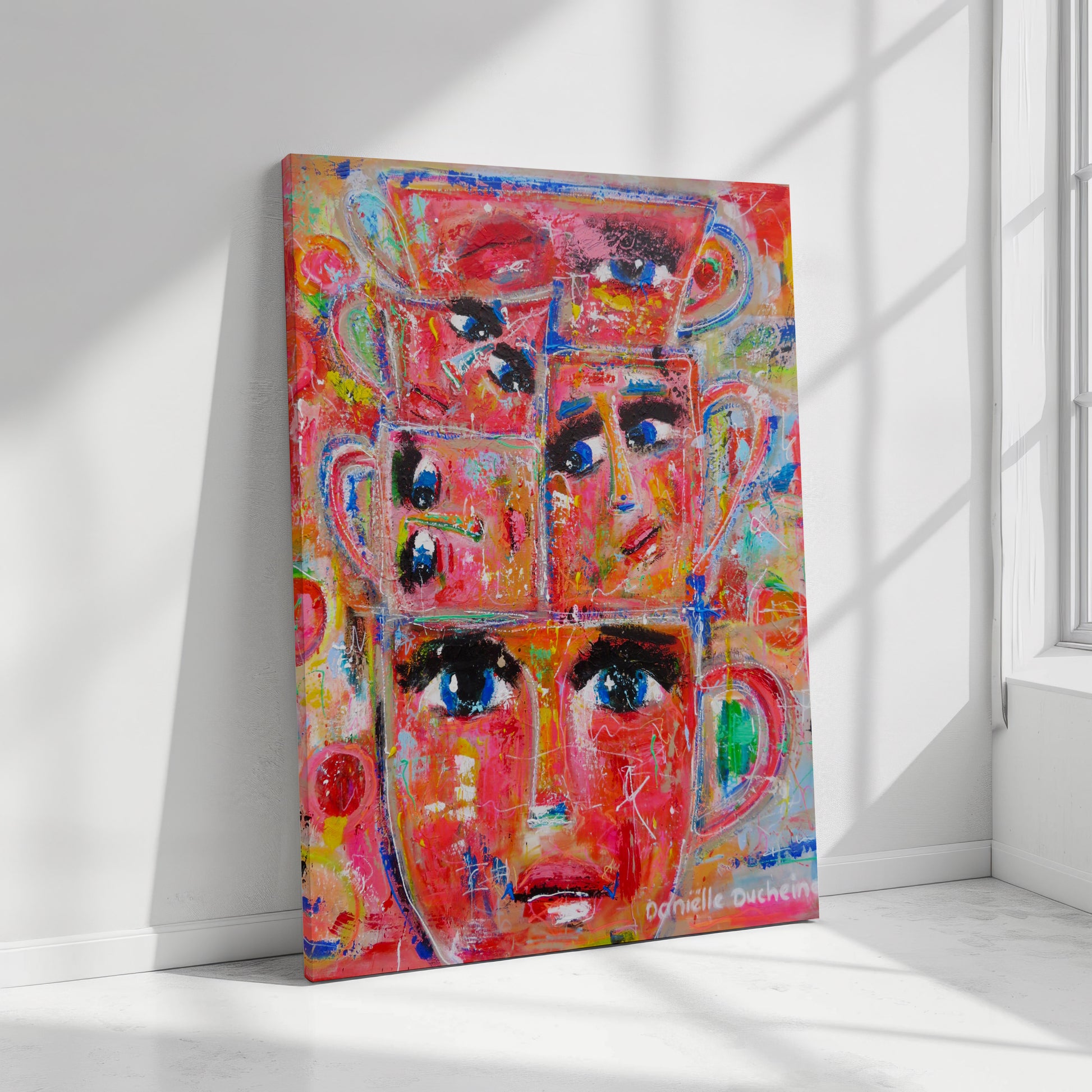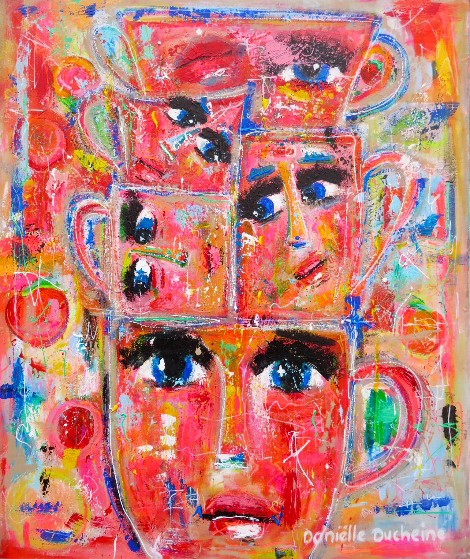 Tijdens het schilderen botsten kleuren, vloeiden lagen samen en begonnen de kopjes met elkaar te praten.