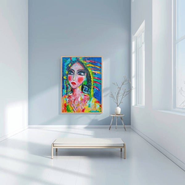 Dit is geen braaf portretje, maar een explosie van kleur, lef en flower power. Geschilderd met acryl en paletmes, intuïtief en rauw. Geen plan, alleen gevoel.